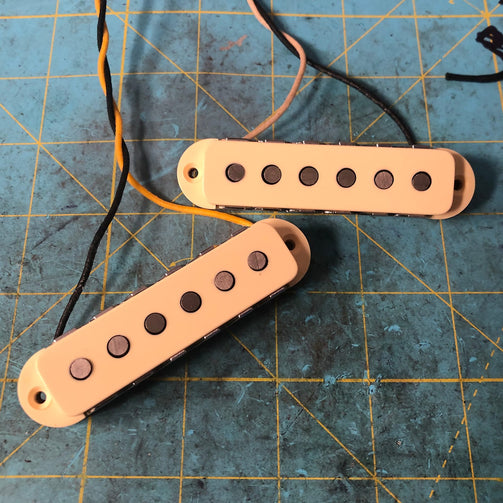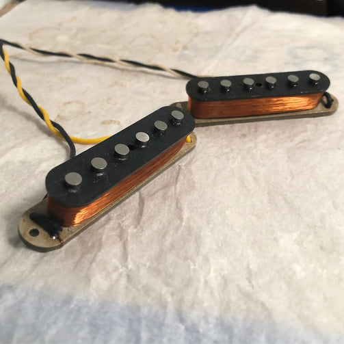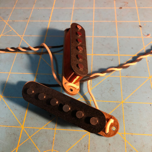 Formvar wire. Inspired by our 1962 shop Jaguar, these pickups are overwound for a fuller sound. They feature 42awg Formvar wire (plain enamel available by request), Alnico 5 flat top magnets, and .22g push-back cloth wire. They are reverse-wound, reverse-polarity (RWRP) so they are hum canceling when both pickups are engaged. These have tone and compression with string clarity that is compatible with modern effects. They are wax potted and ready to give your Jaguar that vintage-inspired tone. Set includes vintage correct neck and bridge. Covers, claws, and screws included.